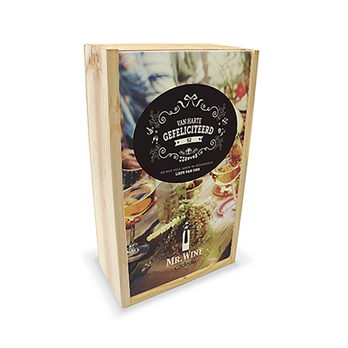Maak van elk wijngeschenk iets bijzonders met onze luxe houten wijnkisten, bedrukt met jouw logo, bedrijfsnaam of persoonlijke boodschap. Perfect als relatiegeschenk, kerstcadeau of promotioneel geschenk. De wijnkisten zijn verkrijgbaar in uitvoeringen voor 1 of 2 flessen en zijn gemaakt van stevig hout met een luxe uitstraling. Laat de deksel full color bedrukken voor een professionele of juist persoonlijke touch.