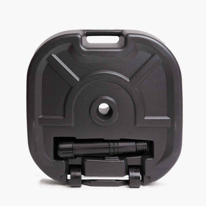 De Parasolvoet is de ideale basis om jouw parasol of beachflag stabiel te plaatsen. Dankzij de ingebouwde wieltjes verplaats je de voet eenvoudig, zodat je schaduw of reclame precies daar kunt neerzetten waar je hem nodig hebt. Vul de voet met water of zand voor extra gewicht en stabiliteit, waardoor hij stevig blijft staan bij wind of op oneffen ondergrond. De parasolvoet is solide en robuust, zodat je parasols en vlaggen op hun plek blijven, ook bij langdurig gebruik.